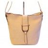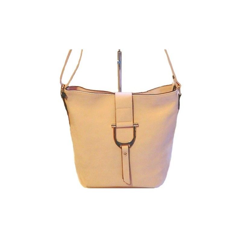 Женская сумка через плечо из кожзаменителя в нежно-розовом цвете. Ширина- 30см (по днищу- 25см), высота-25см, толщина -14см. С внешней задней стороны сумки есть карман на молнии. Сумка застегивается на молнию и на застежку. Внутри сумки есть два больших отделения, центральный карман на молнии, 2 боковых накладных кармана и боковой карман на молнии. Тканевая подкладка. Длина плечевой ручки max-125см.