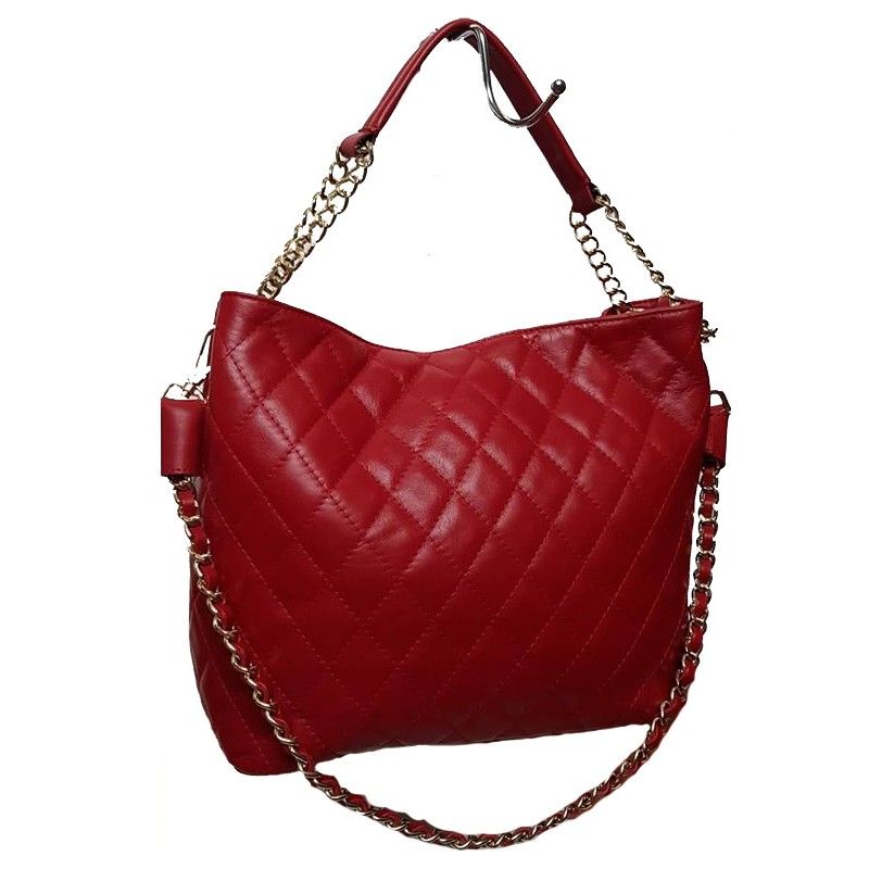 Женская сумка из натуральной стеганой кожи Bottega Carele BC225 (Италия). Размер: 31см x 27см x 17.5 см. Вес - 1кг. Внутри сумки есть два больших отделения, центральный карман на молнии, боковой карман на молнии и кармашек для мобильного телефона. Сумка застегивается на молнию. Ко дну сумки прикреплены металлические ножки. Пристегивается длинная плечевая ручка в виде цепочки. Фурнитура в золотистом цвете.