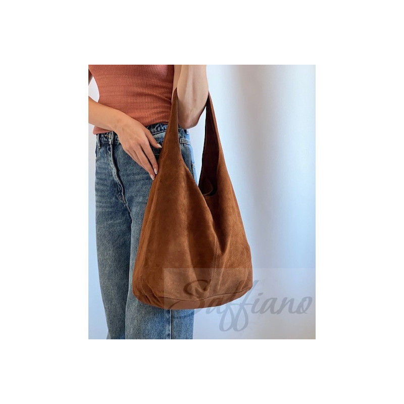 Женская сумка (торба) через плечо из натуральной замшевой кожи Сделана в Италии. Внутри сумки есть одно отделение с кошельком на цепочке. Кошелек застегивается на молнию. Сумка застегивается на застежку-магнит. Без тканевой подкладки. Цвета: красный, синий, серый, черный, песочный и рыжий. Ширина - 35см, высота с ручкой - 60см, толщина - 17 см. Вес - 0,5 кг.