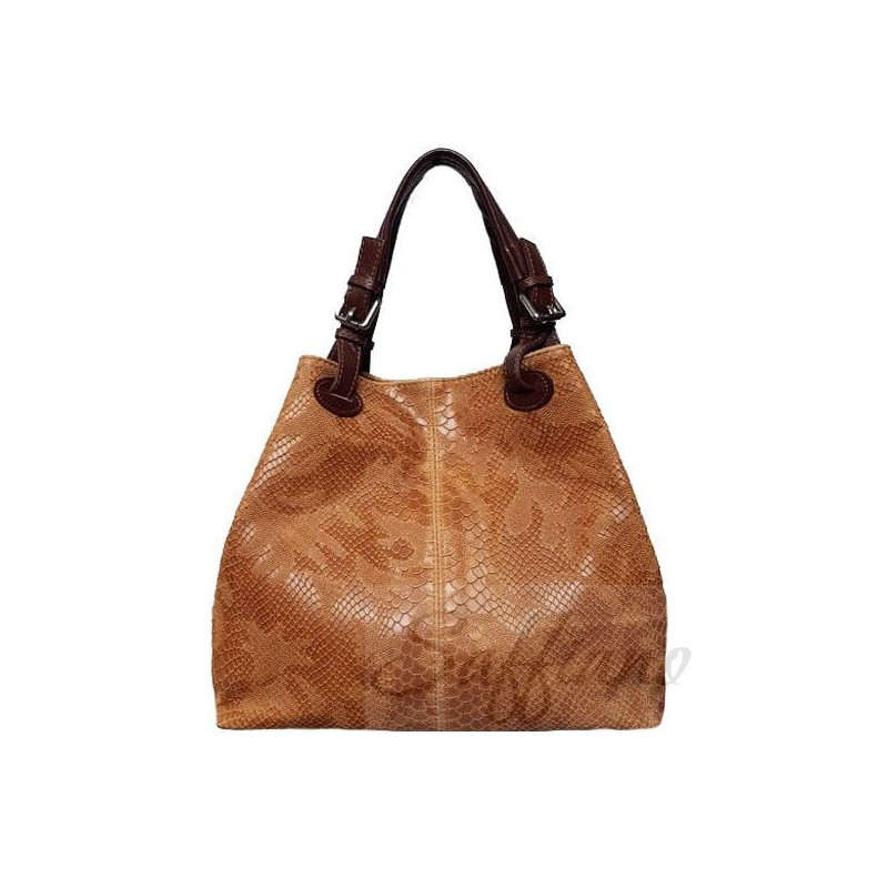 Жіноча стильна сумка з натуральної шкіри під рептилій, зроблена в Італії. Усередині сумки є два відділення, центральний кишеню на блискавки, бокова кишеня на блискавці і кишеня для телефону. Довжина ручок регулюється. Розміри: ширина - 34 см, висота - 26 см, товщина - 18 см. Вага - 0,67 кг.