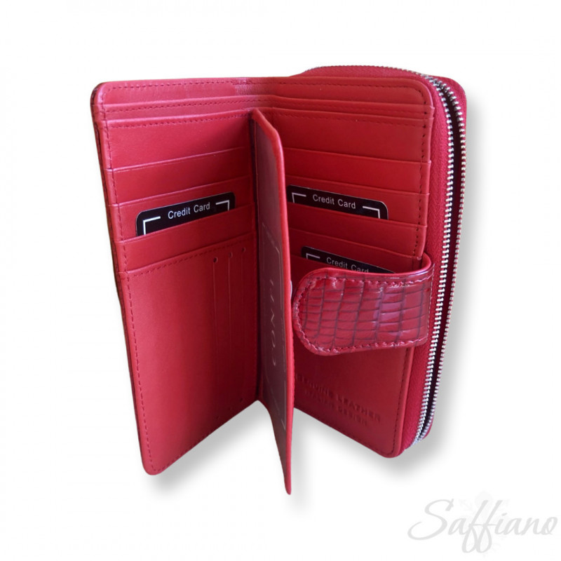 Класичний жіночий гаманець на блискавці (Італія) зроблений з високоякісної гладкої шкіри. Усередині гаманця 2 великі відділення для грошових купюр, кишеня на блискавці для дрібних грошей, вкладки для кредитних та візитних карток. Колір: червоний.