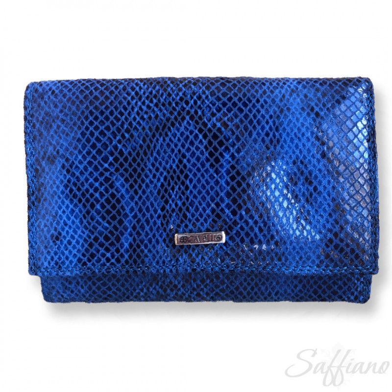 Жіночий шкіряний гаманець з тиснення під пітон в синьому кольорі. Застібається на кнопку. Розмір 15,5 см * 10,5 см * 3см. Усередині гаманця є відділення для грошових купюр, безліч вкладок та відділень для документів та кредитних карток.
